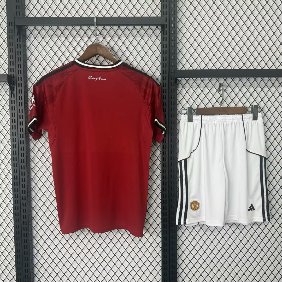 חליפת ילדים מנצ'סטר יונייטד בית 25/26 – חולצה ומכנס באדום הקלאסי של השדים האדומים 🔴⚽🔥